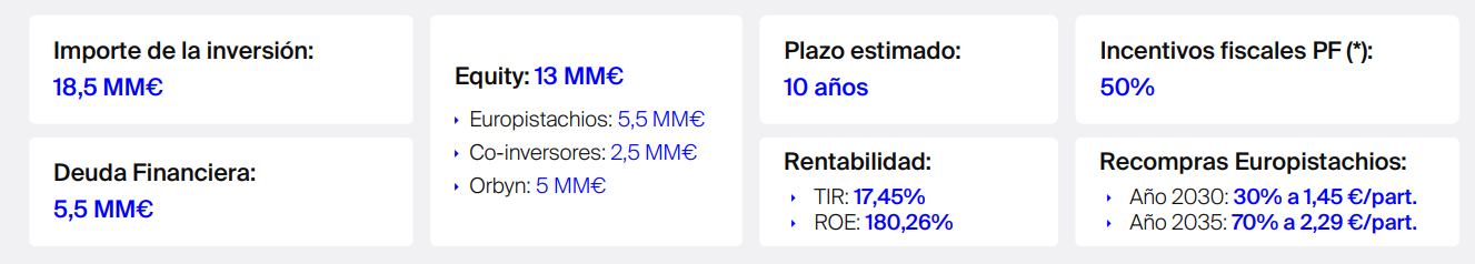 (*) EUROPISTACHIOS 2070, S.L. es una empresa de reciente creación, por lo tanto, los inversores, siempre y cuando no hayan superado el importe máximo de deducción establecido en la Ley del IRPF, por inversión en empresas de reciente creación (para el que se establece un límite de 100.000€ al año) podrán beneficiarse de un incentivo fiscal del 50% sobre su inversión en el proyecto en su declaración del IRPF.